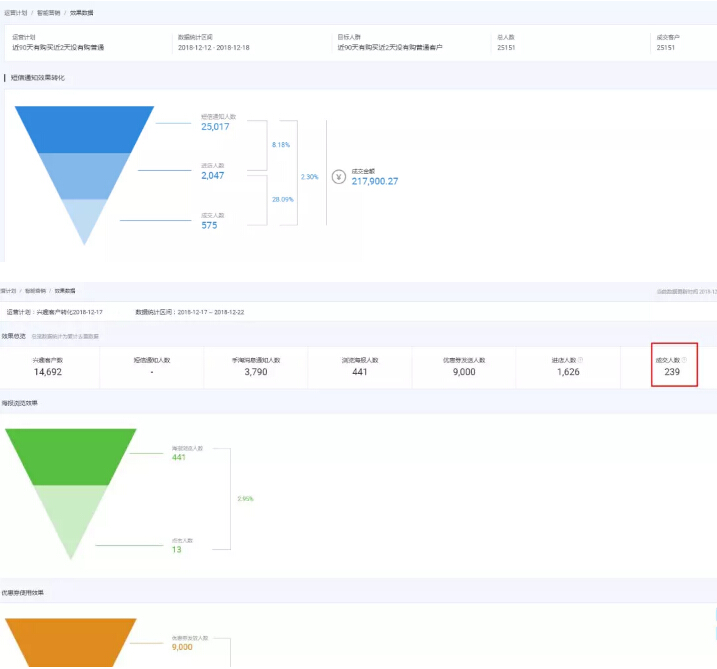 我们可以看到,这是双12大促期间的老客户数据,第一张图是短信营销其中一部分客户的数据;第二张图是平时给兴趣客户发优惠券的成交数量。短信4分一条,优惠券和海报设置免费。只要我们做好用户分层和话术处理就可以几乎不花钱或者用很少的钱赢得更多转化和免费订单。
