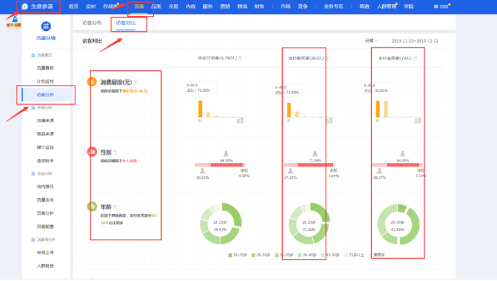店铺的受众人群并不是我们个人主观的进行判断猜想而来,是需要通过数据来进行具体的分析的。那么我们该如何下手去找店铺人群呢?我们可以通过生意参谋-流量-访客分析-访客对比来了解自己店铺的购买人群特性,主要是看支付新买家以及支付老买家