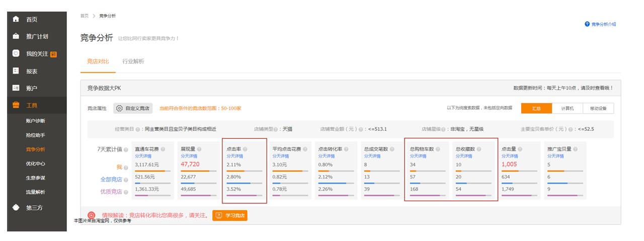 首先是点击率,测款的时候我们的点击率没有必要非要高于同行,但最起码要达到行业平均,这样可以保证我们分数不会下降。具体同行的点击率怎么看?可以在直通车工具里的竞争分析中了解。